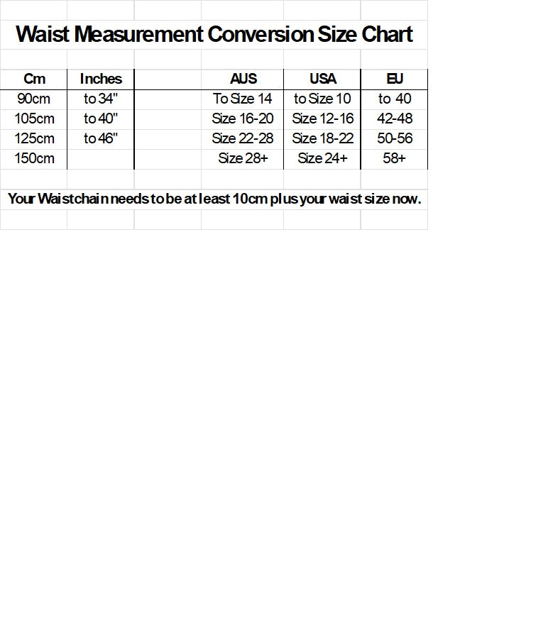 We have our chain sizes listed in cm, but here you will find the USA and EU conversion sizes for your reference.
